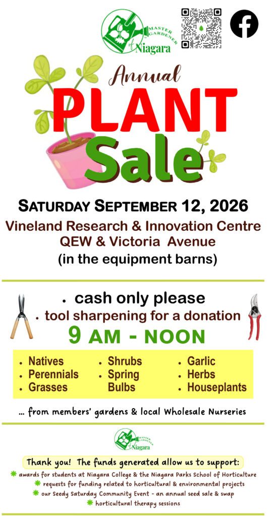 Master Gardeners of Niagara include St. Catharines, Grimsby, Fort Erie, Port Colborne, Welland, Niagara Falls,Niagara-on-the–Lake, West Lincoln and Lincoln (Smithville & Beamsville)